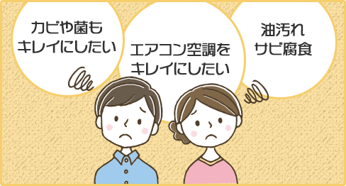 本当に大変な汚れを取れにくい箇所でいうと、キッチン、換気扇、台所、厨房など食品を扱う箇所は雑菌、カビ、汚れなど、梅雨時期、湿気が多い水回りは菌が増殖するのでキレイにしたい箇所です。