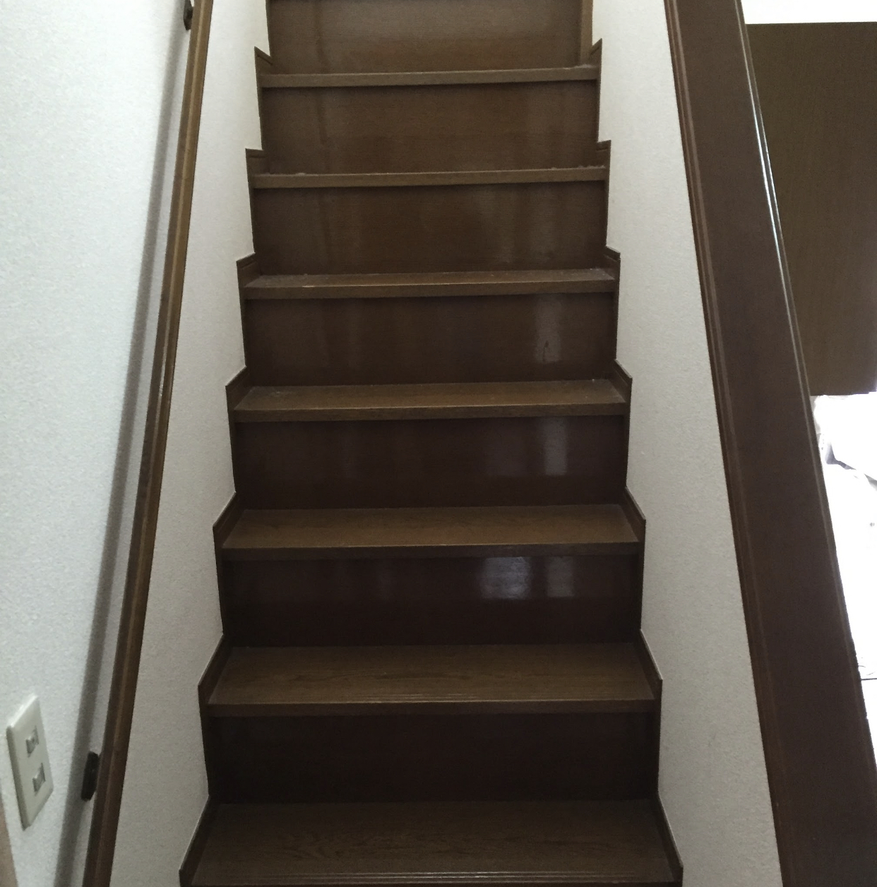 階段の床、木目部分のワックスがけで、ピカピカにします。